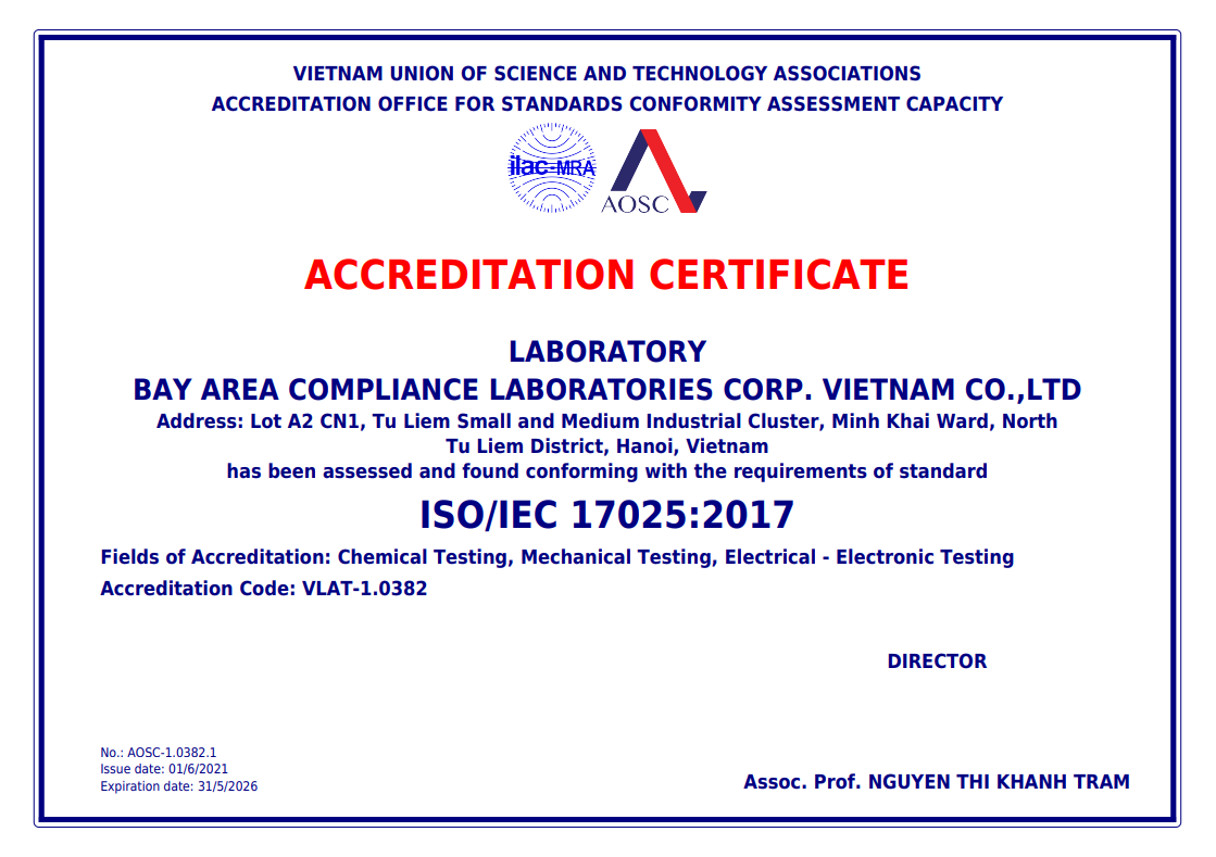 BACL越南分公司成立于2016年,坐落于越南首都河内市和第一大城市胡志明市,现拥有员工100+人,占地面积3000m2。BACL越南河内实验室是倍科集团在东南亚地区继台湾(汐止/林口)、韩国BWS实验室布局之后的又一个重要站点。BACL越南河内实验室严格按照ISO/IEC 17025质量管理体系建立,早在2019年就获得了越南AOSC认可机构的认可。BACL越南河内实验室总面积约2000m2,包含RF无线射频实验室、化学实验室、安规实验室、可靠性实验室、能效实验室、玩具实验室、物理性能实验室、失效分析实验室等,可为广大客户提供一站式检测认证解决方案。BACL越南河实验室配备了数千台精密进口仪器,包括德国R&S、美国Keysight和AR、日本岛津、安捷伦等国际知名厂商的尖端测试仪器,是东南亚地区最具实力和公信力的检测认证机构之一。